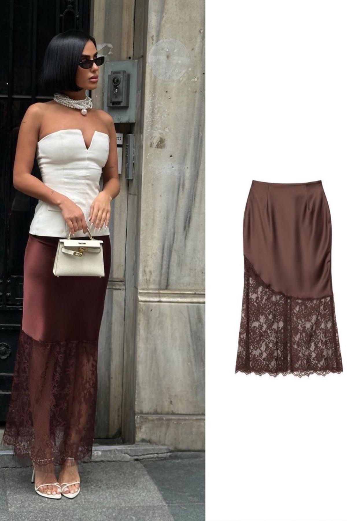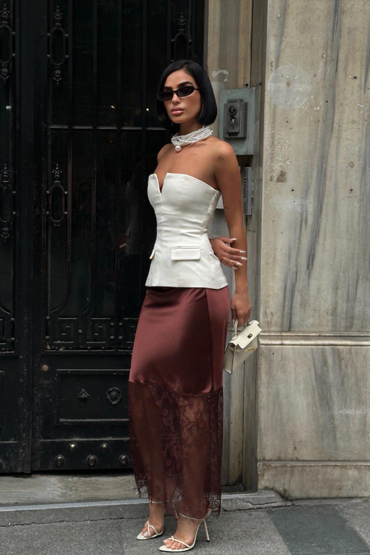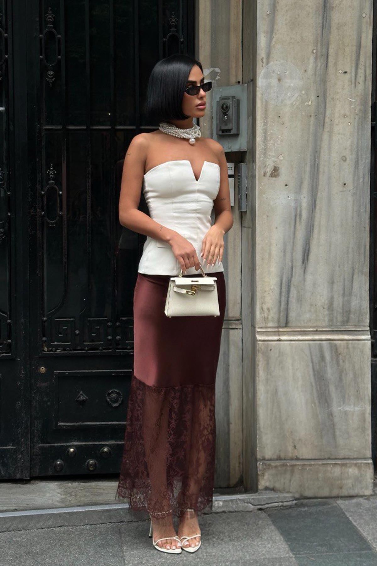 Dantel Detay Saten Etek - Kahverengi (3M-3635)
