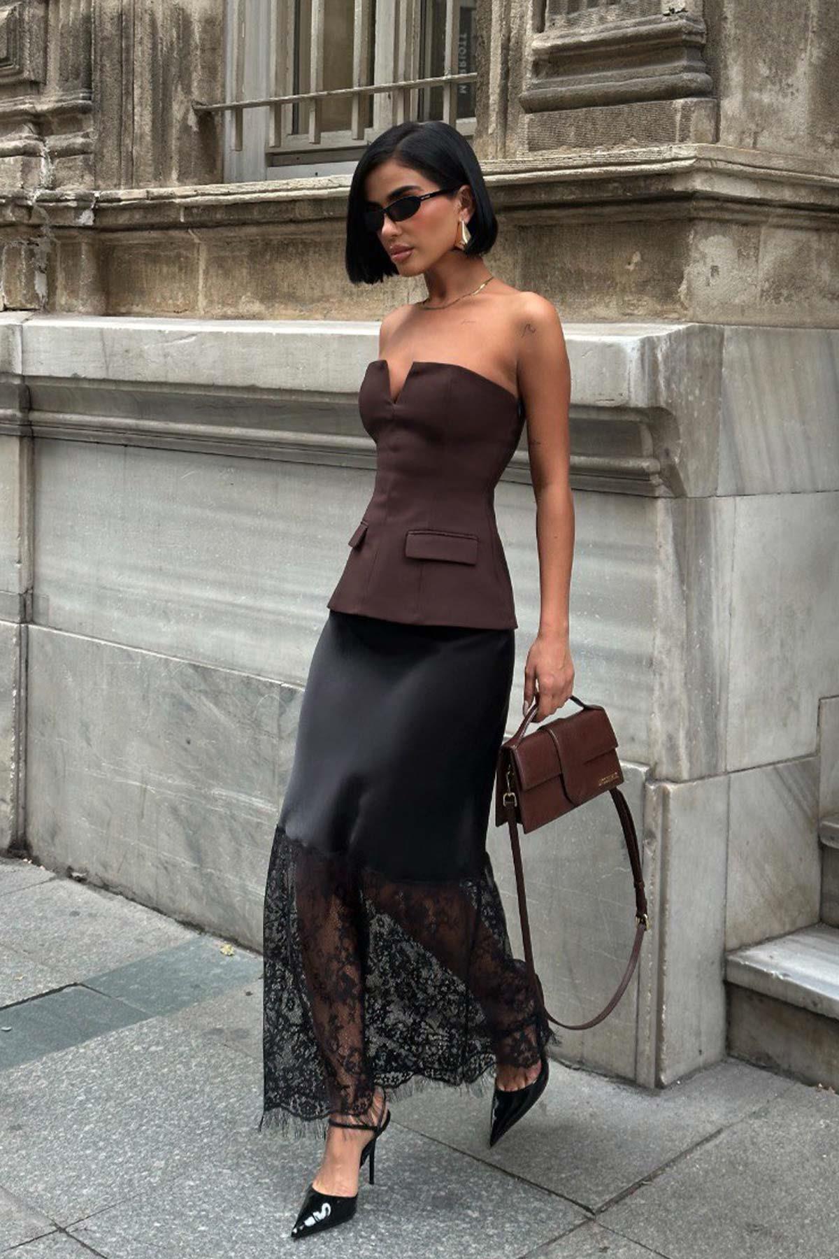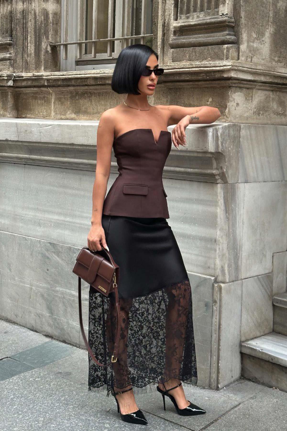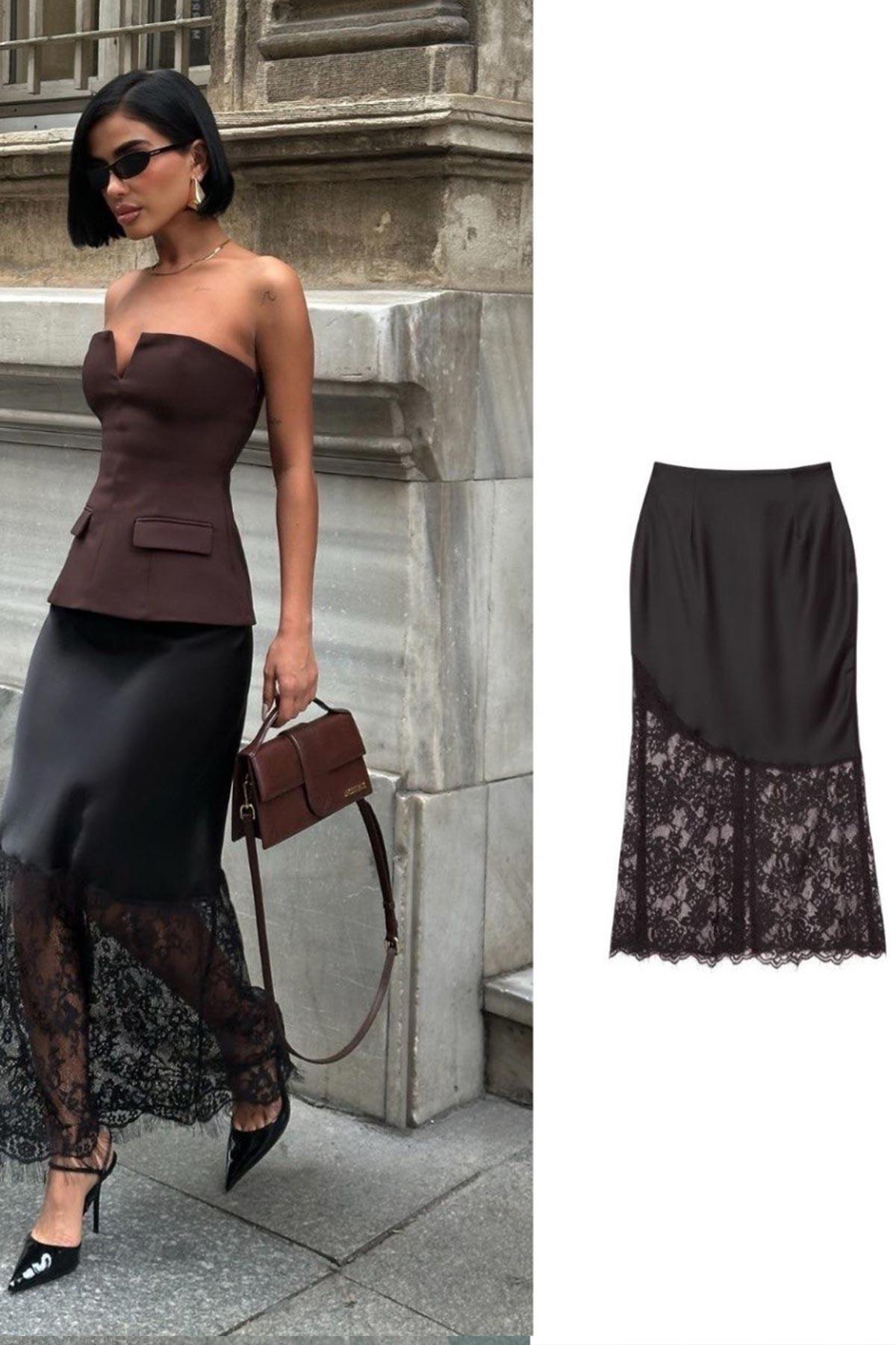 Dantel Detay Saten Etek - Siyah (3M-3635)