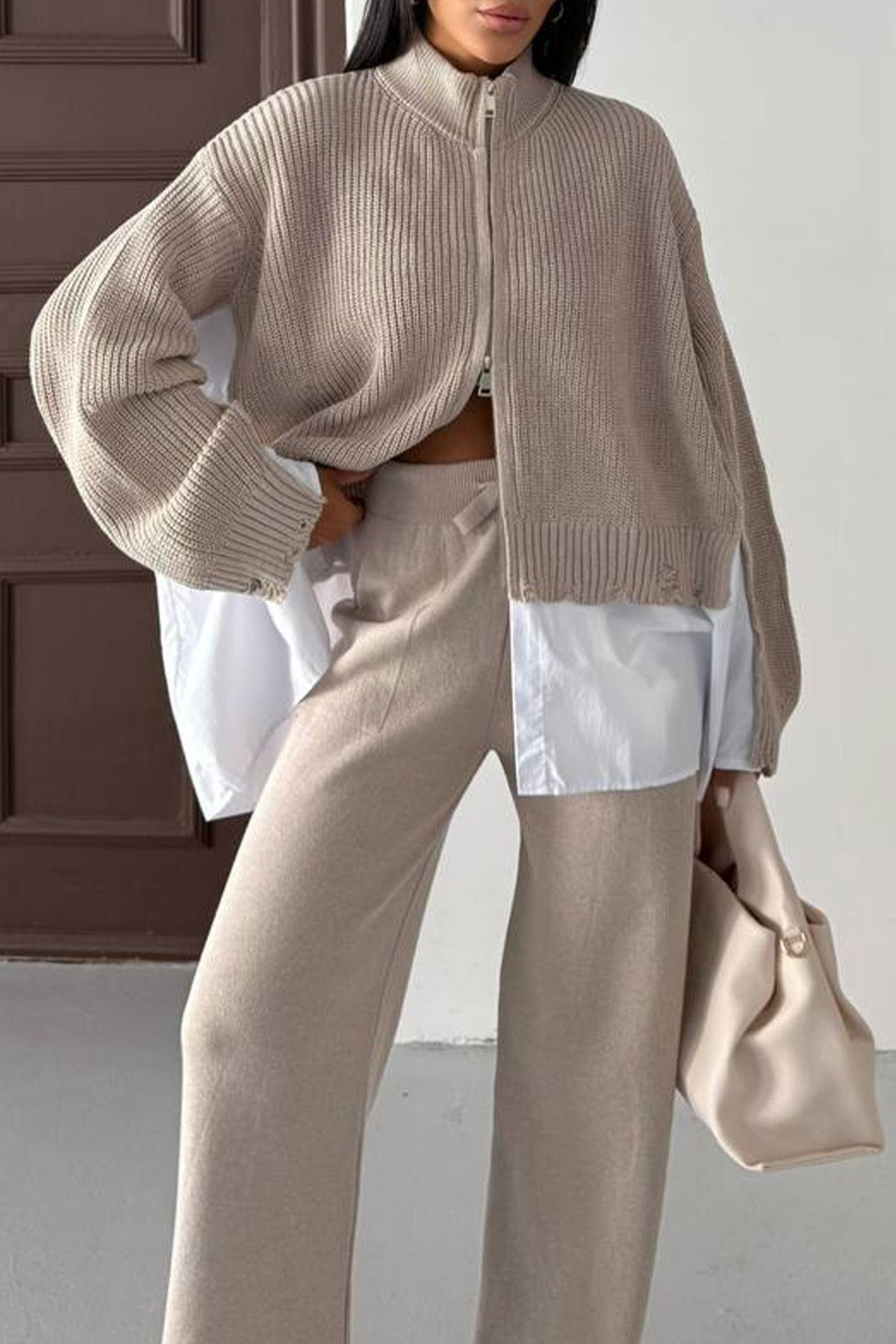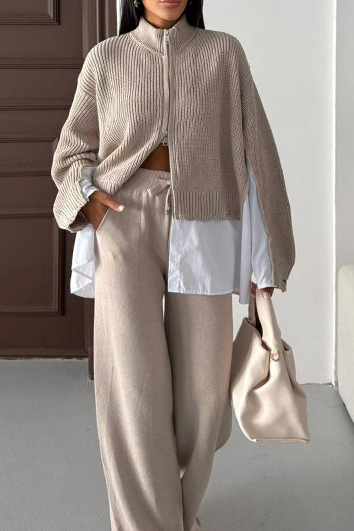 Etek Ucu Gömlek Detay Triko Takım - Bej (3M-3628)