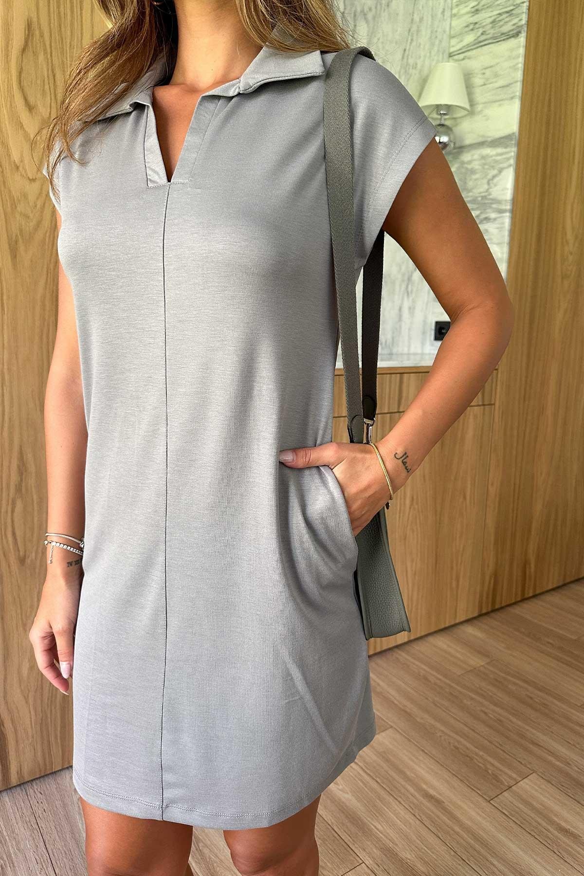 Günlük konforu şık bir duruşla birleştiren Polo Yaka Modal Kumaş Kadın Kısa Kol Elbise - Gri, minimal gri tonuyla kombinlerinize eşlik eder.