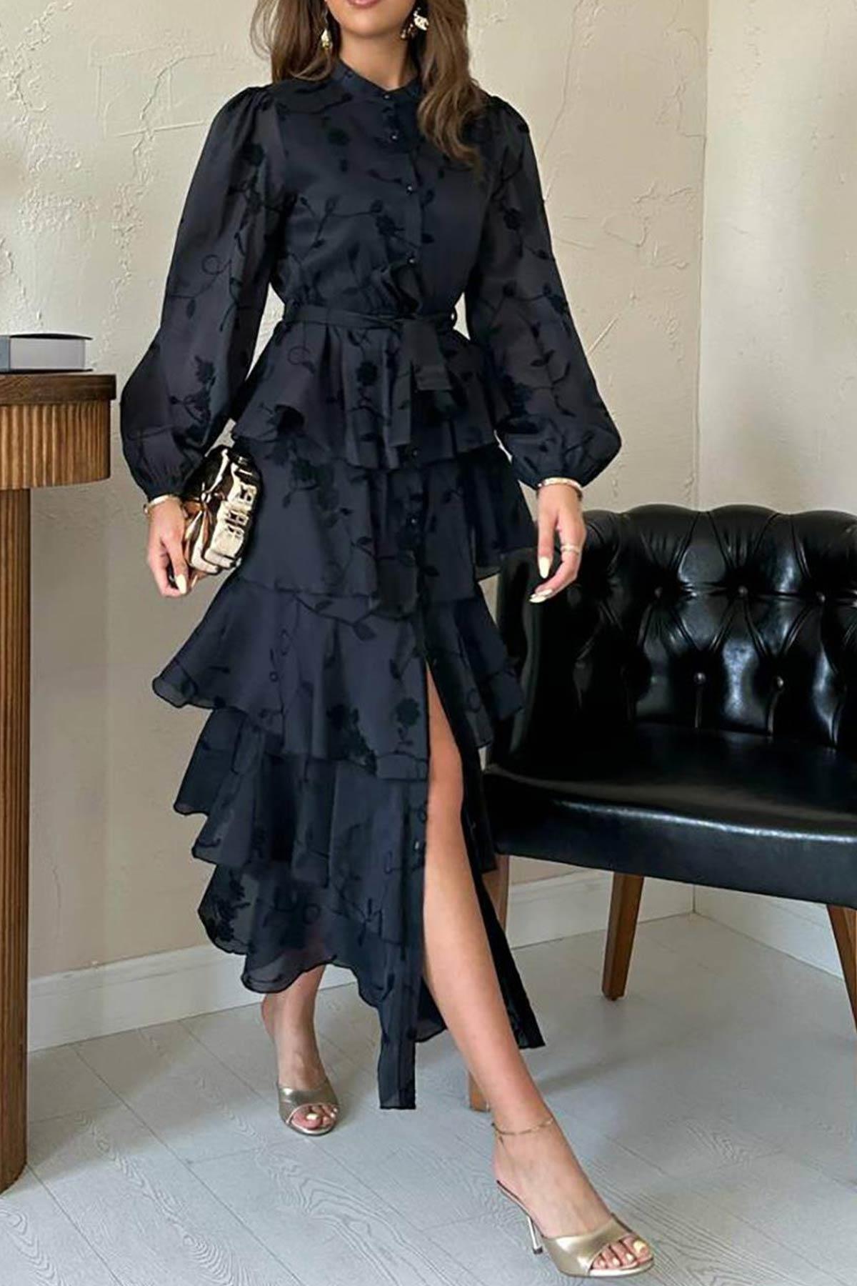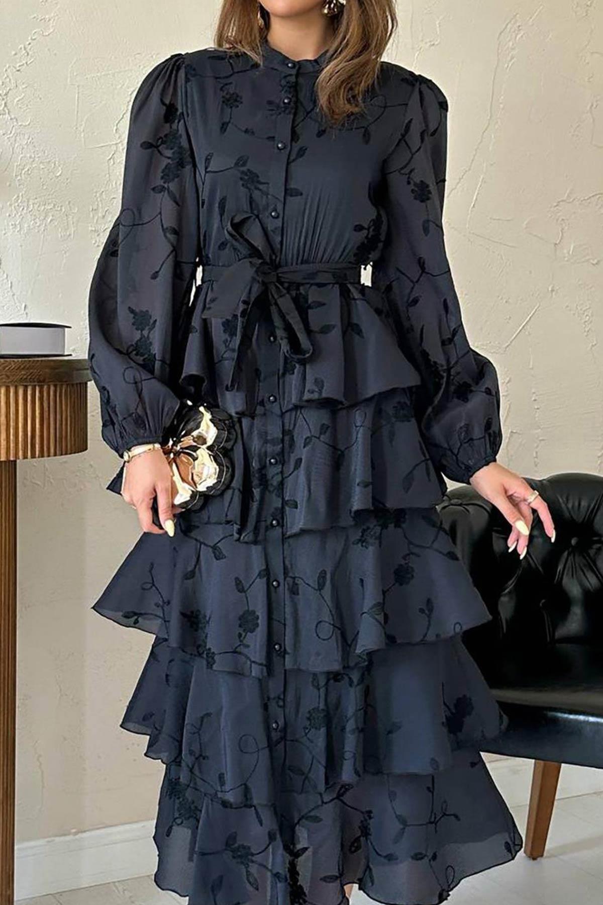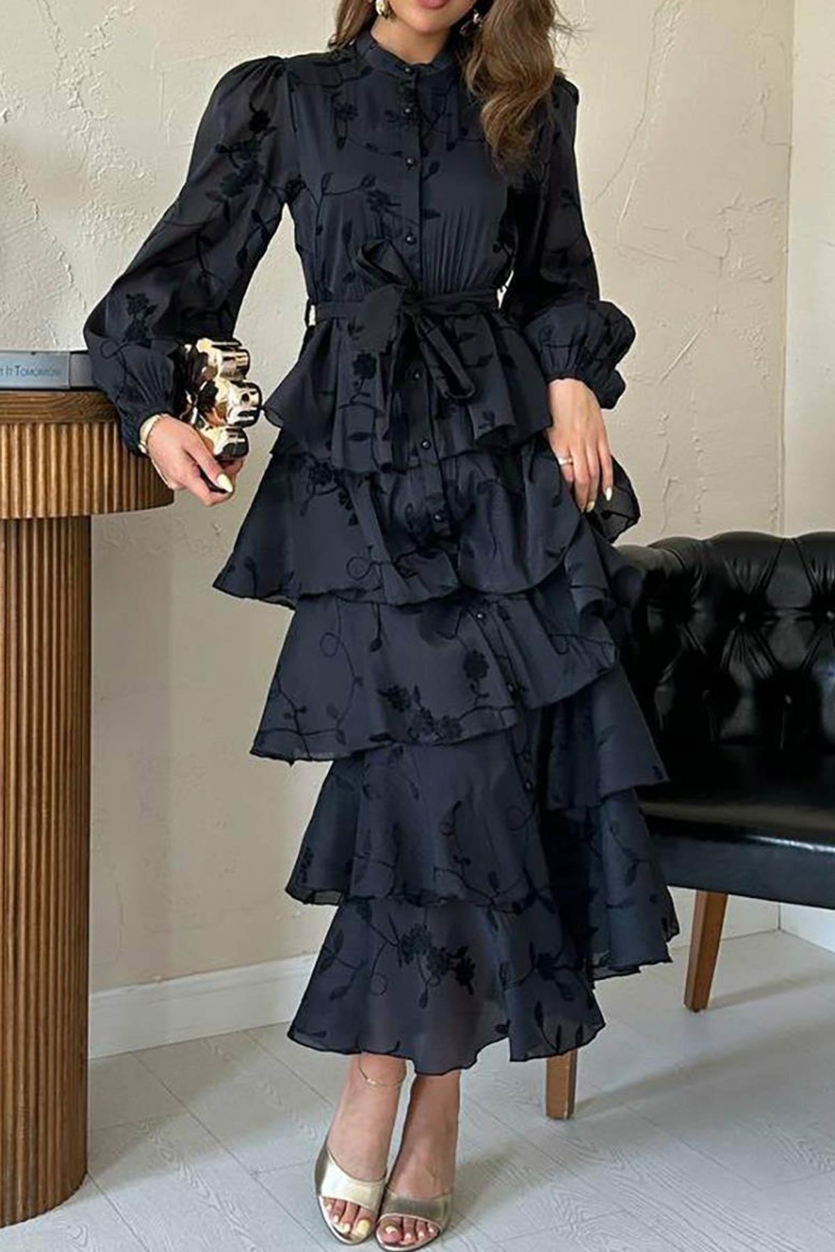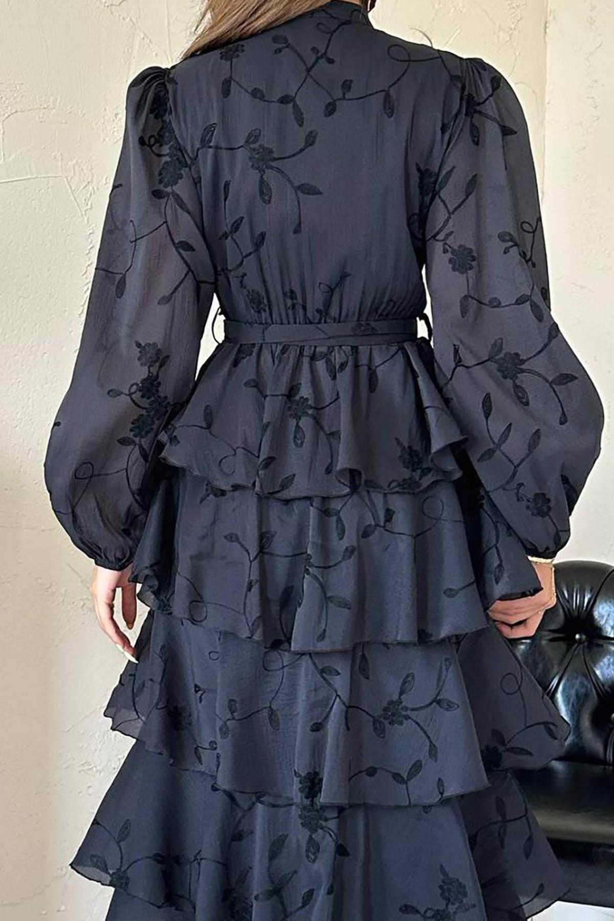Uzun Kollu Volanlı Kendinden Desenli Kadın Elbise - Siyah (3M-3626)