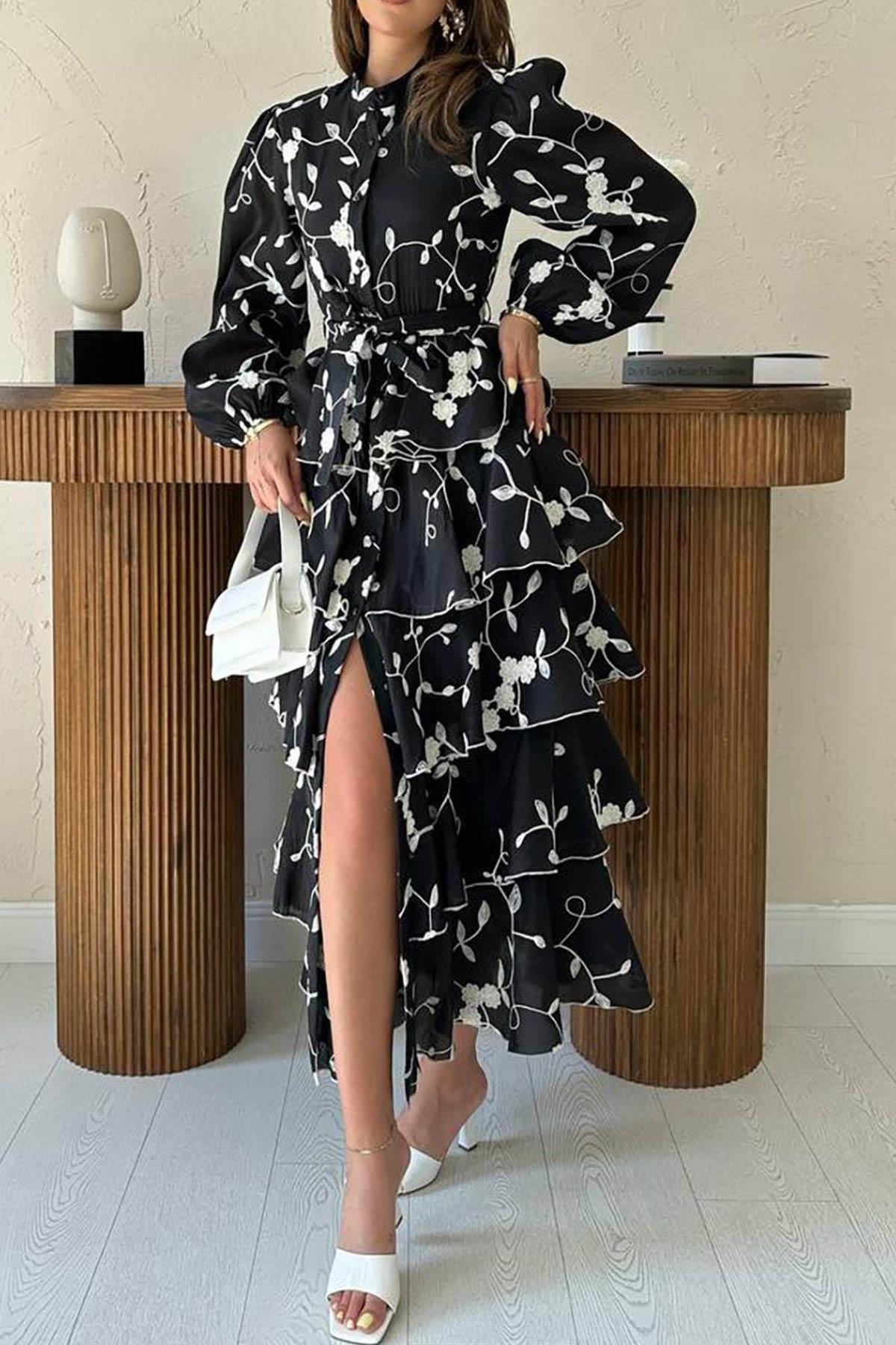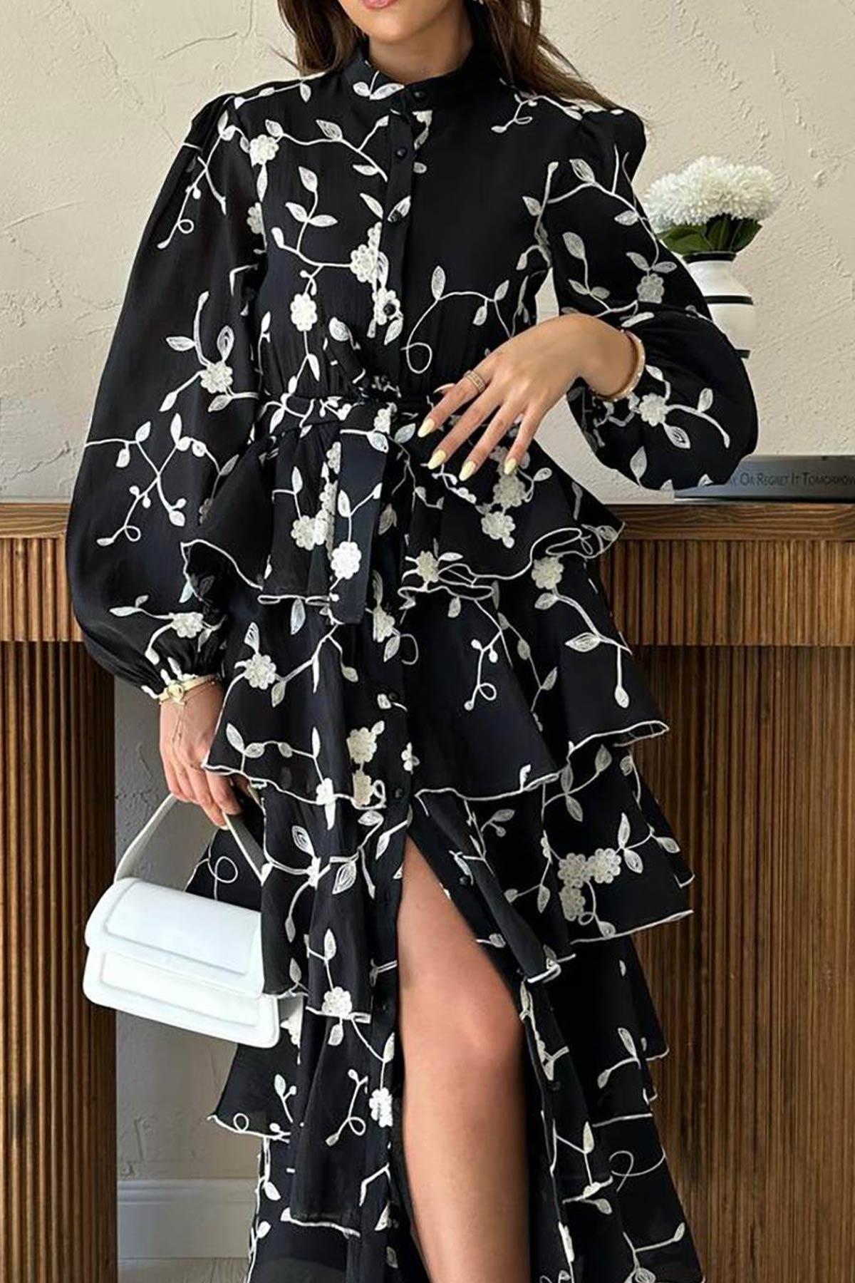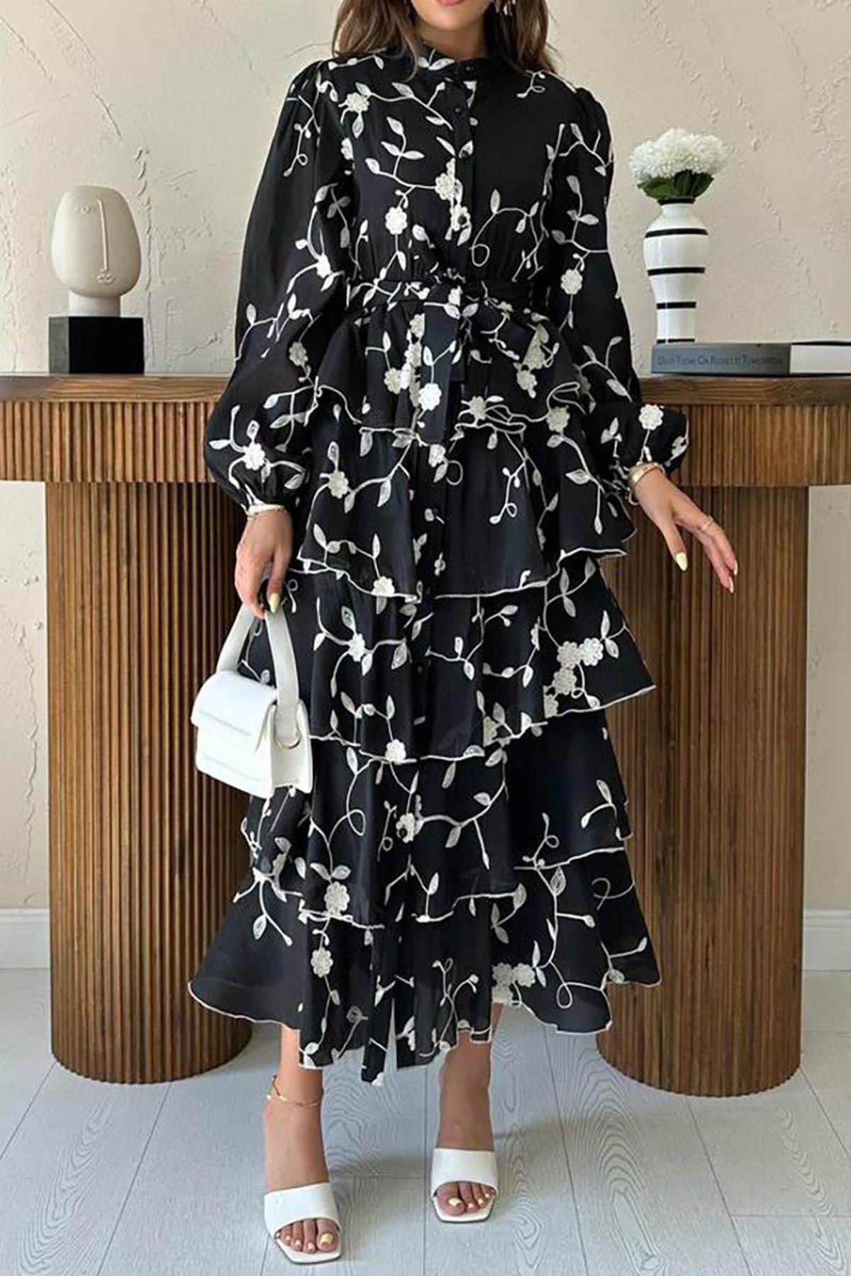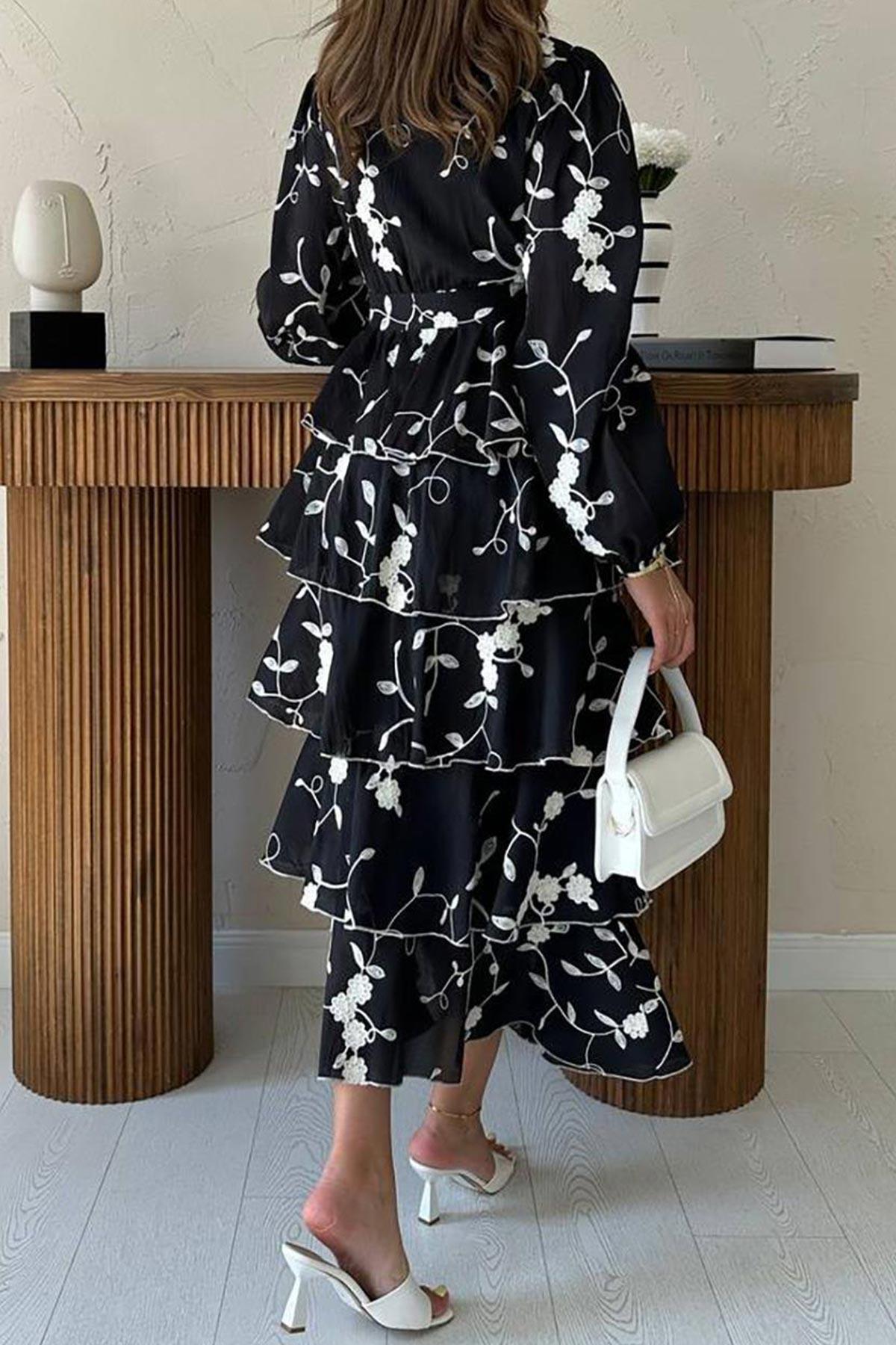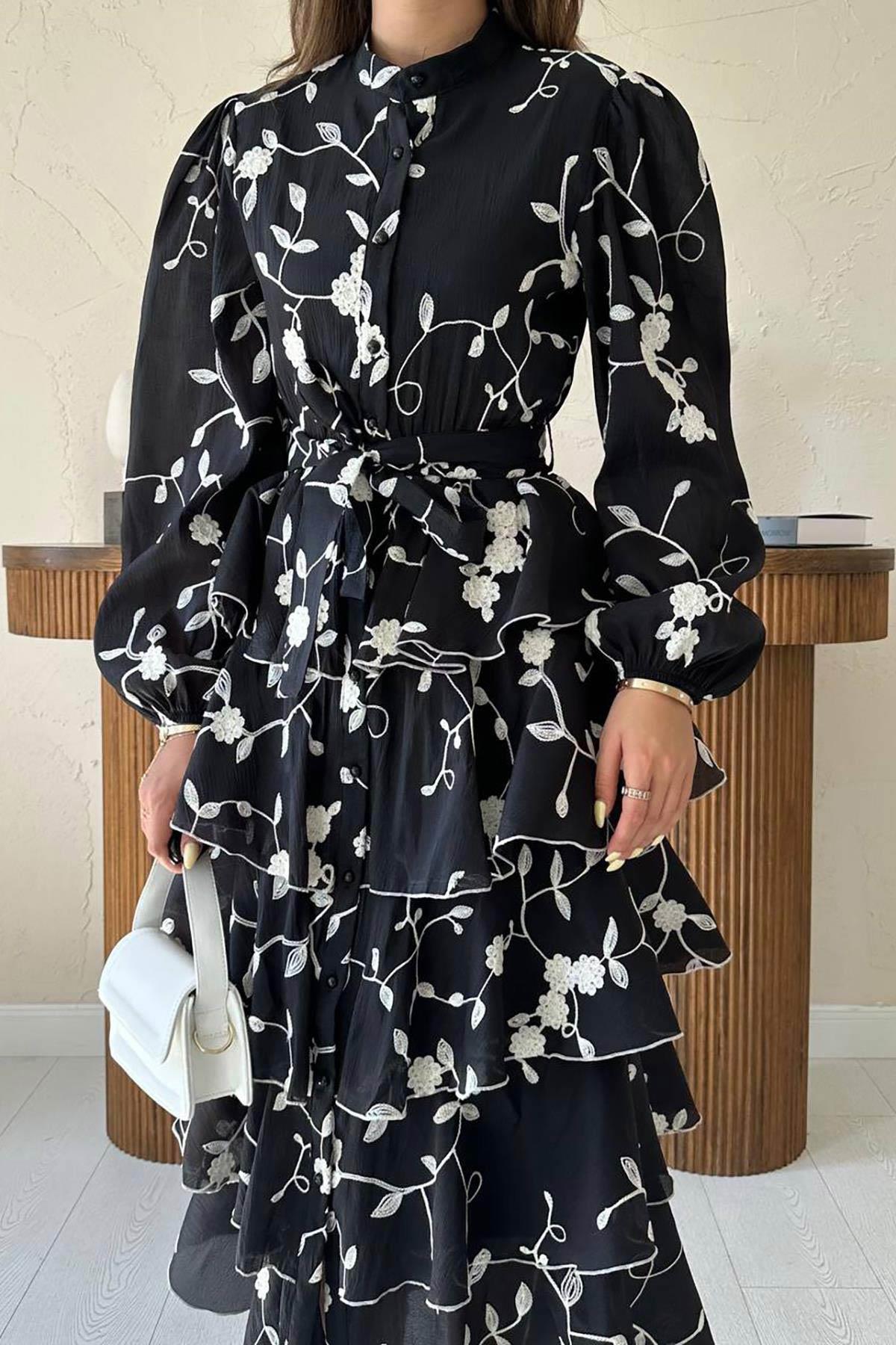 Uzun Kollu Volanlı Kendinden Desenli Kadın Elbise - Siyah/Bej (3M-3626)