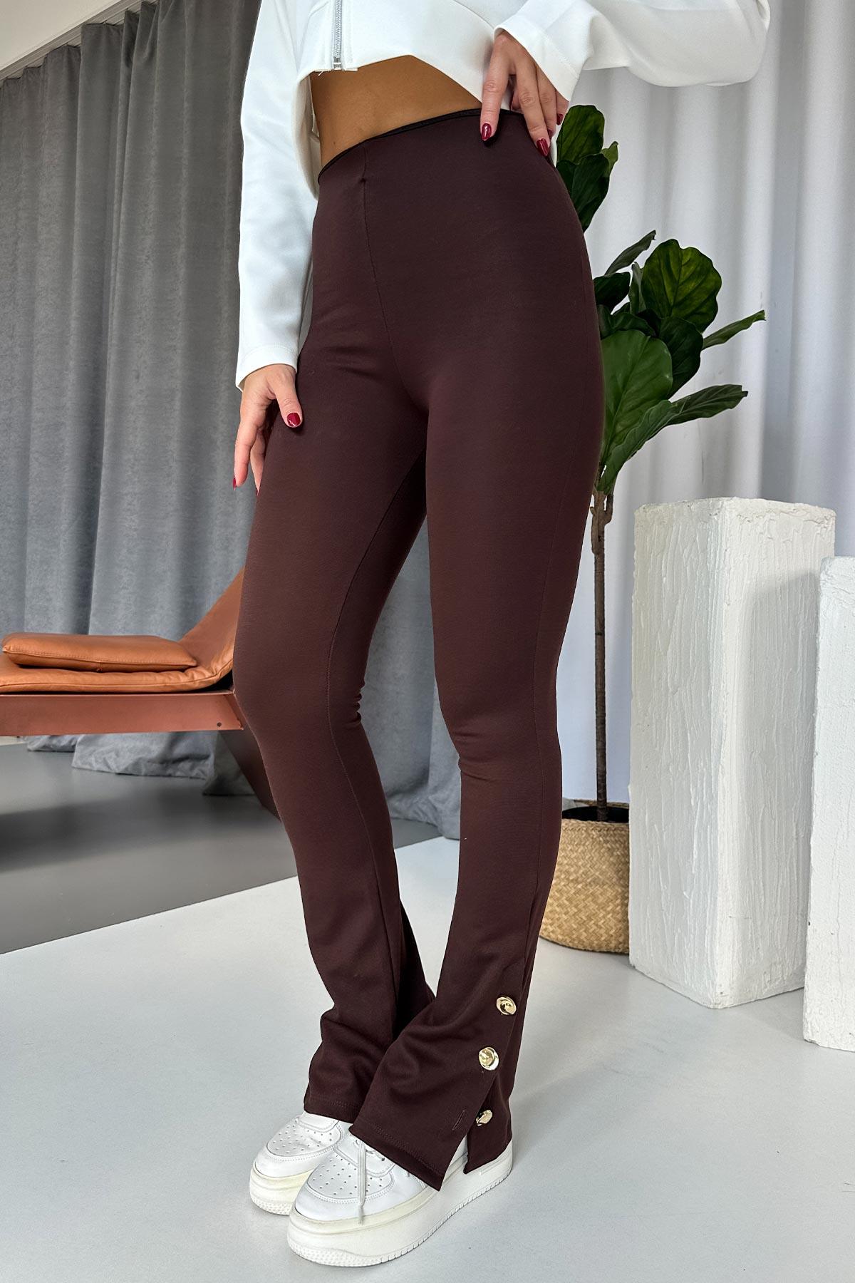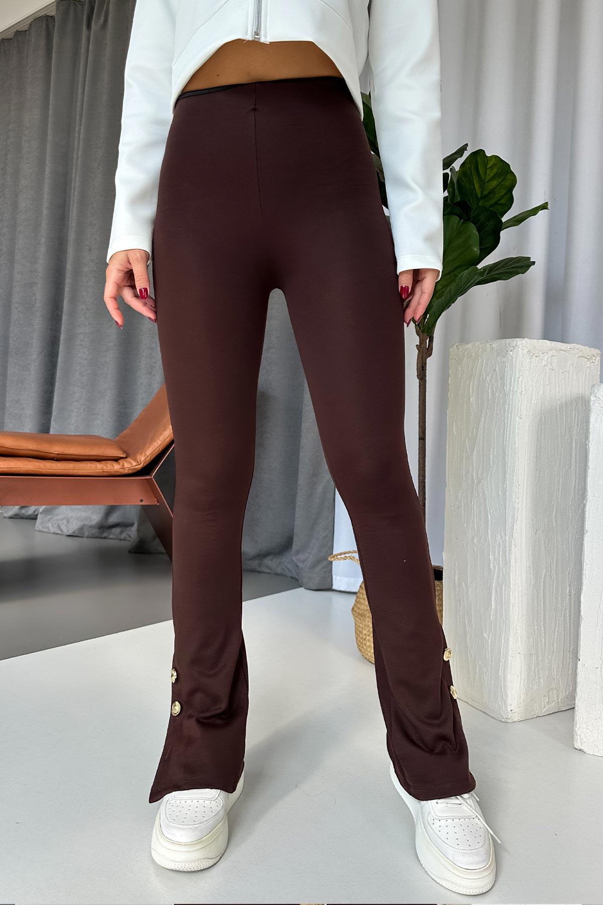 Modern çizgiyi zarafetle buluşturan Yüksek Bel Gold Düğme Detay İspanyol Paça Kadın Tayt - Kahverengi, klasik siyah asaletiyle stilinize sofistike bir dokunuş katar.