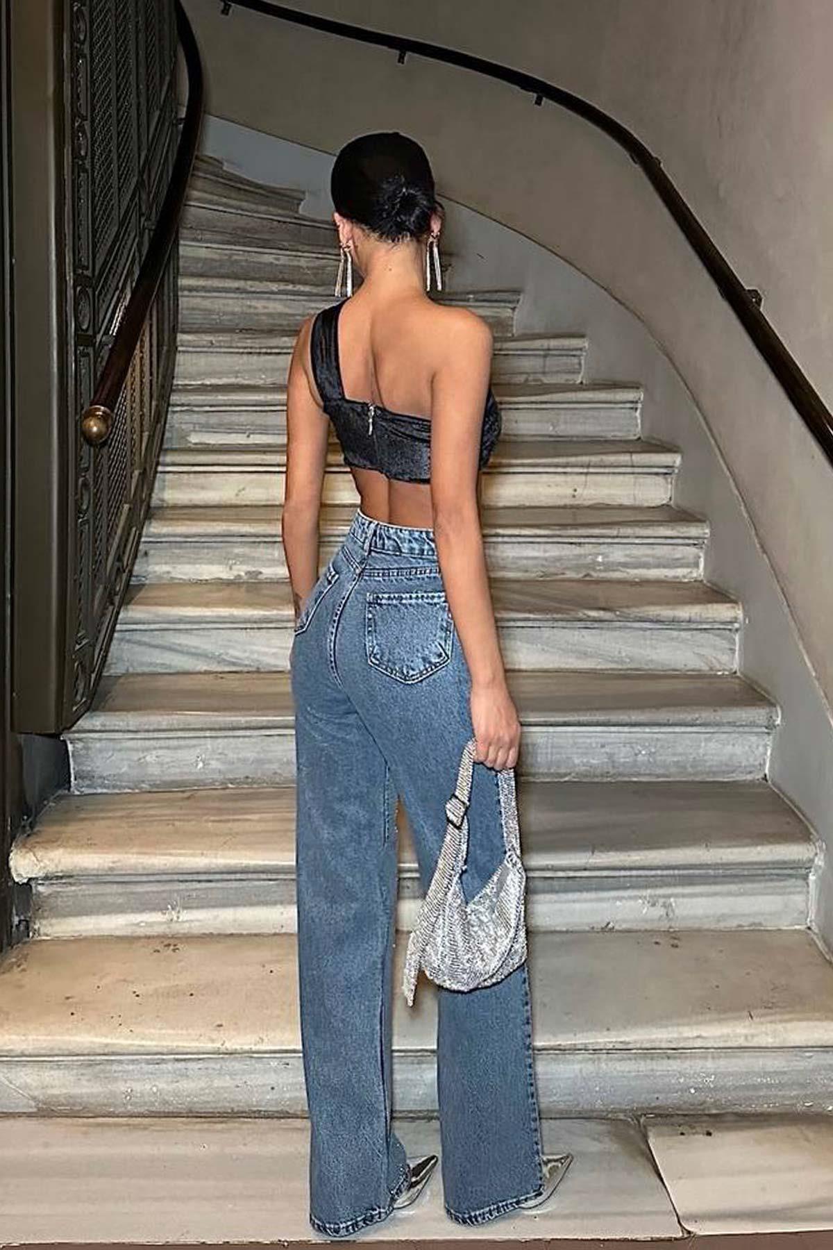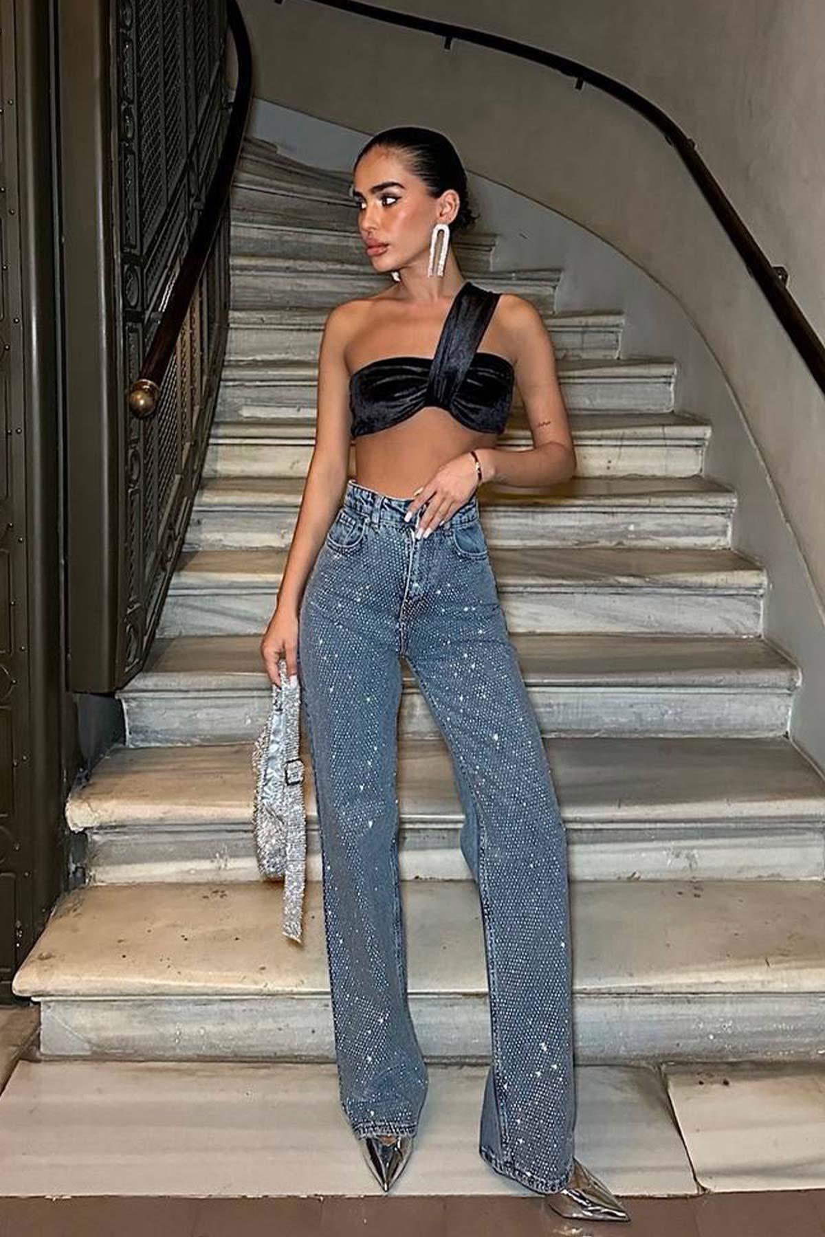 Yüksek Bel Likralı Taşlı Palazzo - Mavi (3M-3639)