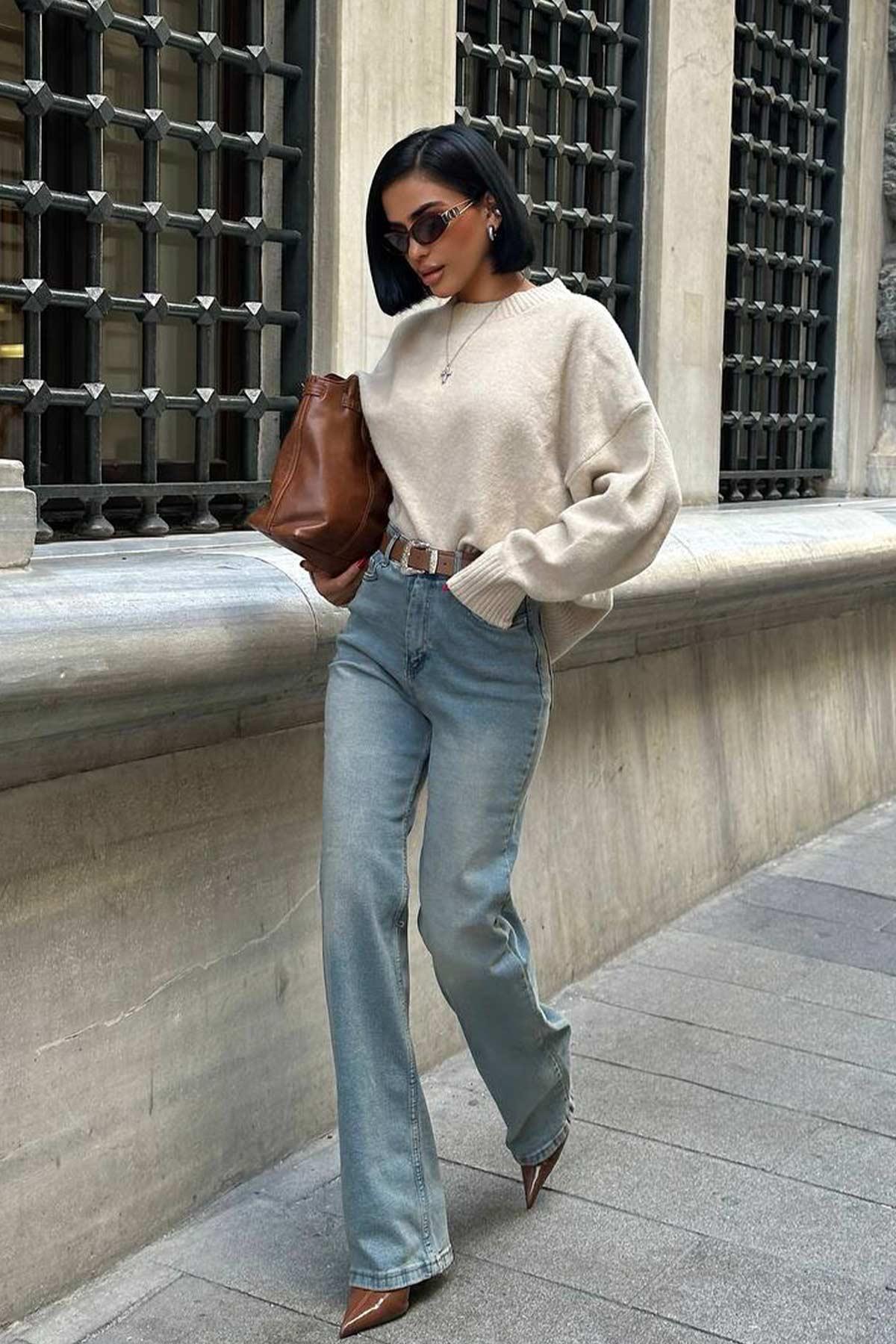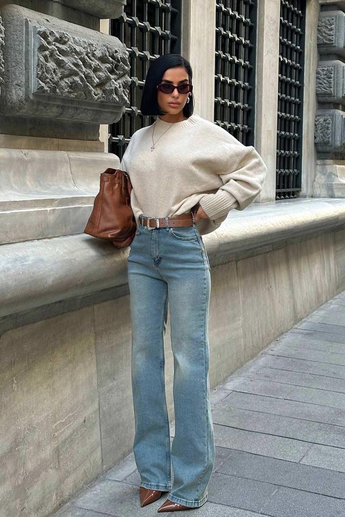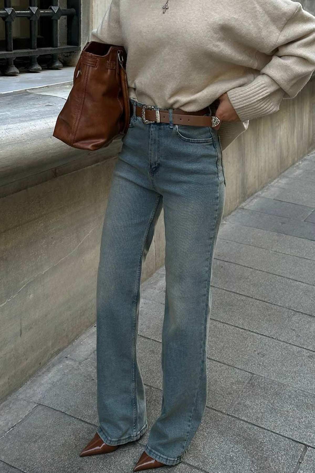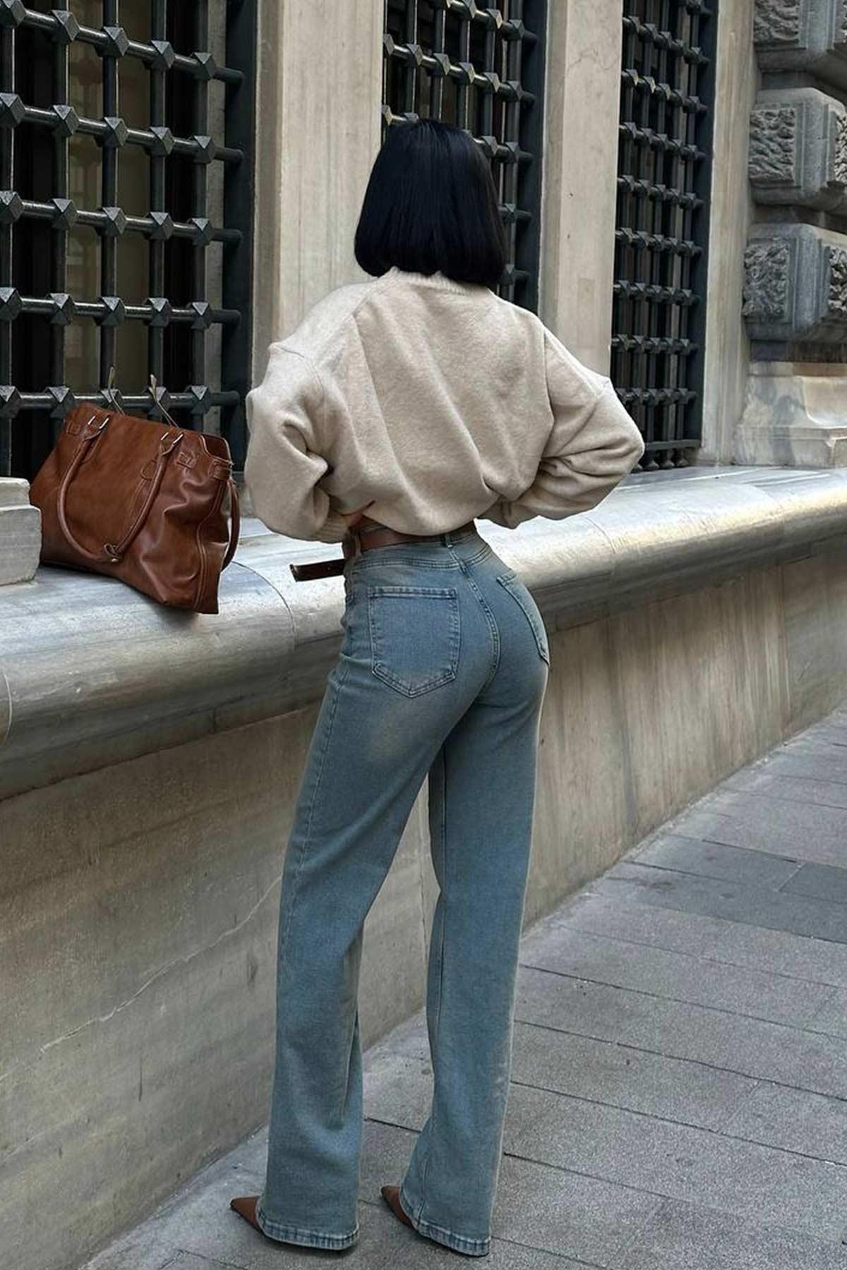 Yüksek Bel Likralı Yeşil Tint Detaylı Palazzo - Mavi (3M-3638)